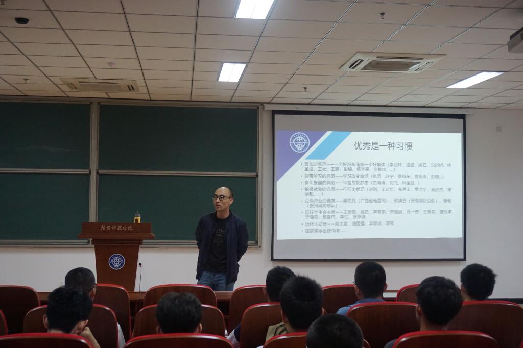 阎老师首先以“优秀是一种习惯”展开话题,分别从班级建设、学习考研、参军报国、就业发展等各个方面列举了我院历届优秀学生代表,讲述了他们坚持奋斗、勇于成功的先进事迹,鼓励同学们用榜样的力量激励自己,学习他们的优良品质和成功经验。随后,阎老师向新生们提出了学习和生活的几点建议,希望同学们建立成人思维,诚信正直,用友善的态度对待身边的人和事,注重身心健康,养成健康的生活习惯。最后阎老师用“天行健,君子以自强不息,地势坤,君子以厚德载物”与同学们共勉,鼓励大家以优秀学长为榜样,不断完善自我,用汗水谱写青春华章。