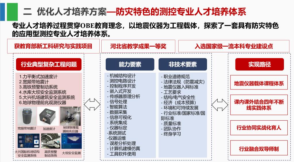 专业坚持OBE理念,构建了地震特色的应用型人才培养体系,重构了以地震仪器为工程载体课程体系、课内课外结合四年不断线实践体系和行业协同育人体系,获得河北省教学成果一等奖。基于学院构建的行业协同育人创新实践平台,学生的工程实践能力显著提高,专业指导学生开展了地震科普进校园、灾害预防与自救互救下乡等社会服务,参加共享杯、挑战杯、互联网+等国家级行业内外竞赛,获国家、省部级奖150余项;部分学生考取中国科学院大学、北京航空航天大学、中国地震局地球物理研究所、中国地震局地震预测研究所等知名院校(所)硕士研究生,多数毕业生在大中型企业迅速成为骨干,毕业生的工程能力得到社会广泛认可和高度评价。