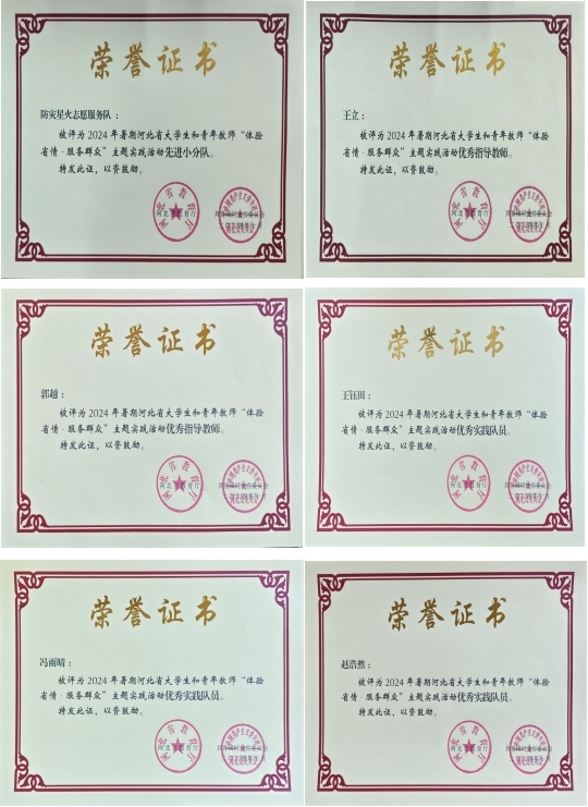 近日,由奥门新浦京官网师生组成的防灾星火志愿服务队,获评2024年河北省“体验省情·服务群众”主题社会实践活动先进小分队,王立、郭越两名教师获评实践活动优秀指导教师,王钰田、冯雨晴、赵浩然三名学生获评优秀实践队员。