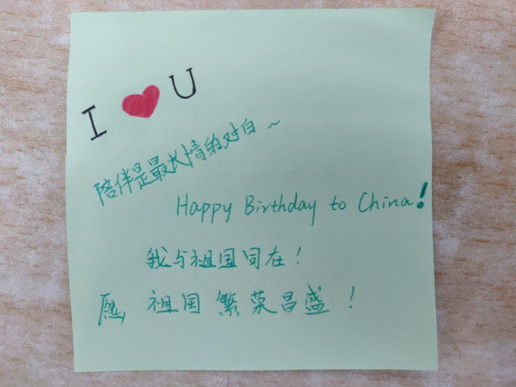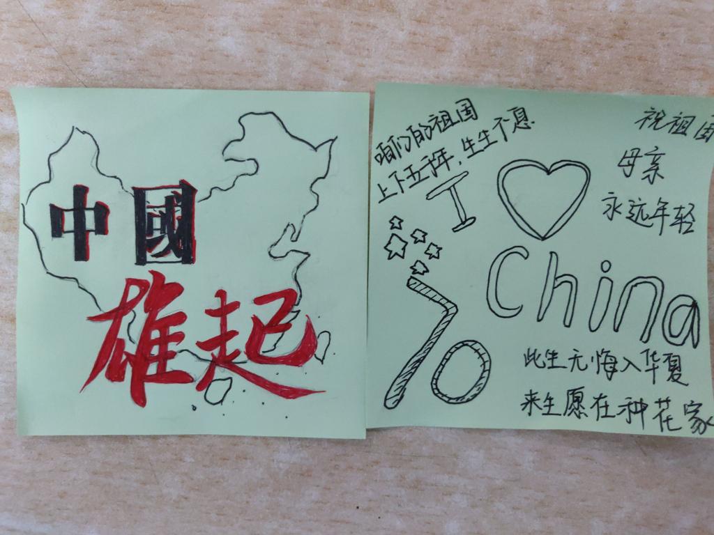 正值新中国成立七十周年之际,同学们的爱国之情尤为高涨。活动开始,工作人员不需要激烈的言语点燃,只是简单的介绍活动规则便让同学们的爱国之情汹涌而出,当工作人员将彩色便签发到每位同学手中后,同学们都认真的思考,满怀着对祖国的热爱为祖国献上最美好的祝福。同学们通过简单的文字,可爱的插画为祖国母亲送上了作为子女对她最美好的祝愿!