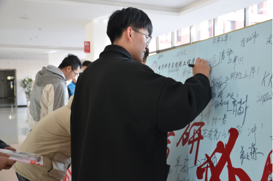 然后为他们发放考研必备文具袋,内含参加考试所必需的的文具。最后,学长学姐们纷纷在考研签名板上写下自己的目标以及祝福。